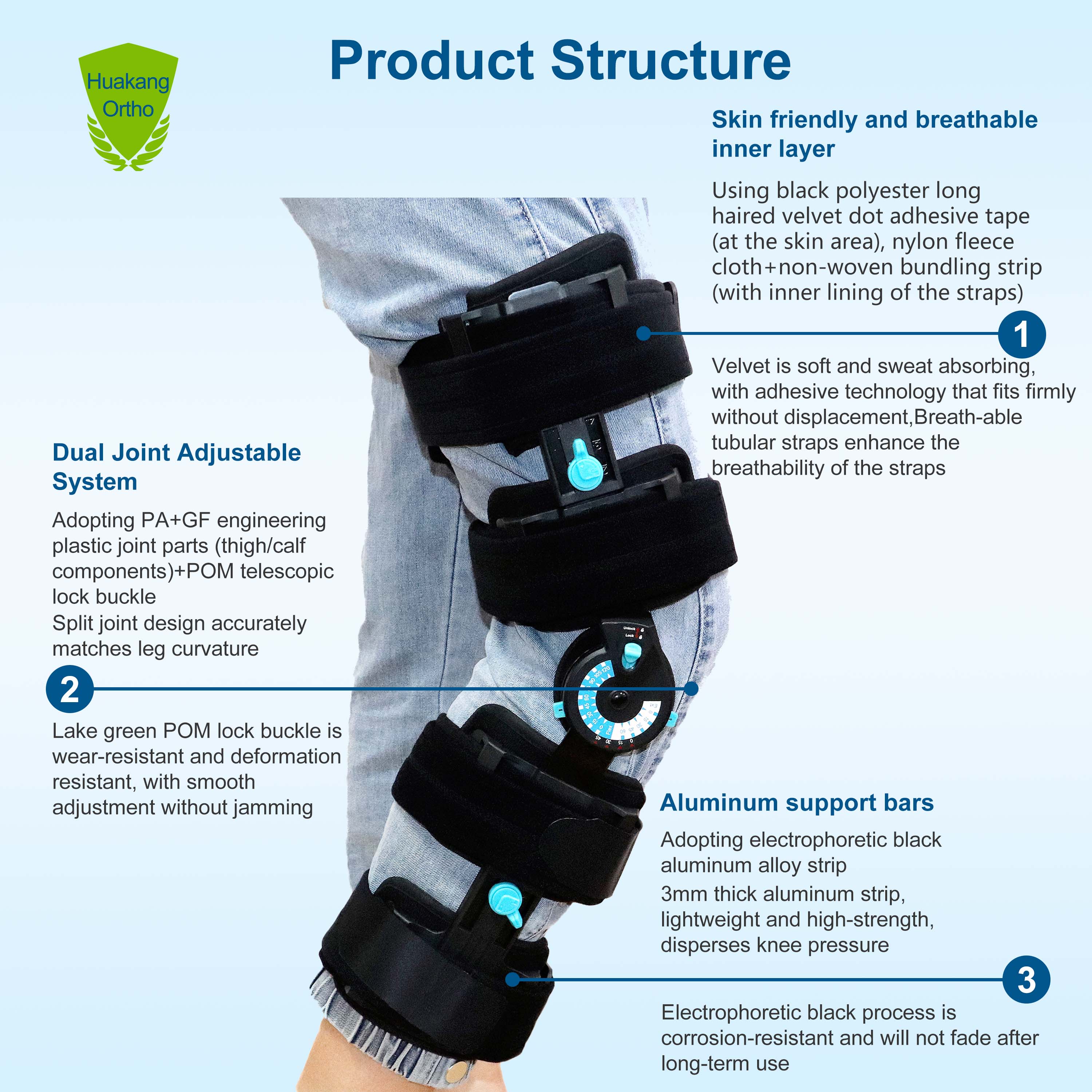 • Someone recovering from ACL reconstruction might use the Huakang Ortho Rigid Hinged Knee Brace, which lets doctors adjust ROM limits as healing progresses (from 0-60 degrees to full movement over time).